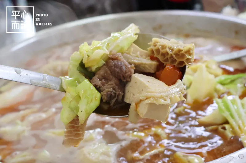 鍋底內含牛肉塊、高麗菜、番茄、白豆腐……,