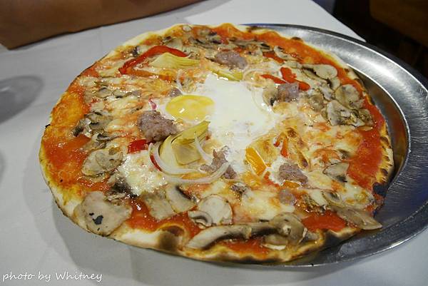 招牌披薩的最大特色在於上頭打了顆蛋 並使用台灣少見的朝鮮薊