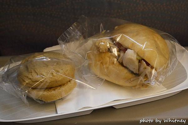 航程中供應了一份烤雞三明治配白巧克力脆片餅乾的簡餐