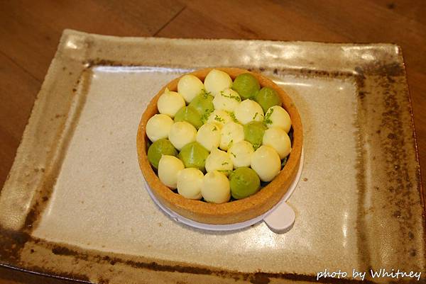 塔上布滿擠成水滴狀的檸檬與抹茶卡士達醬