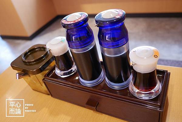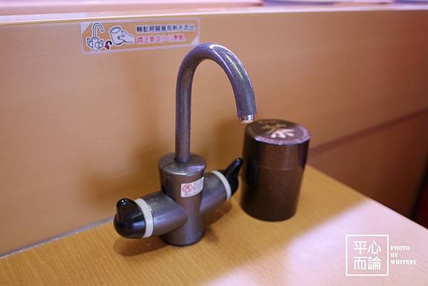 桌上有沾醬、薑片、筷子及熱水水龍頭