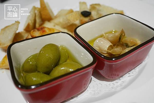 服務人員就送上招待的麵包盤及餐前酒
