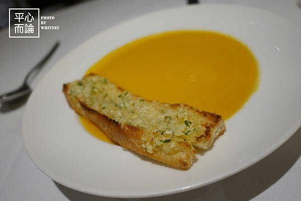 【Pumpkin, carrot and orange soup with parmesan garlic bread RM18】