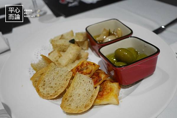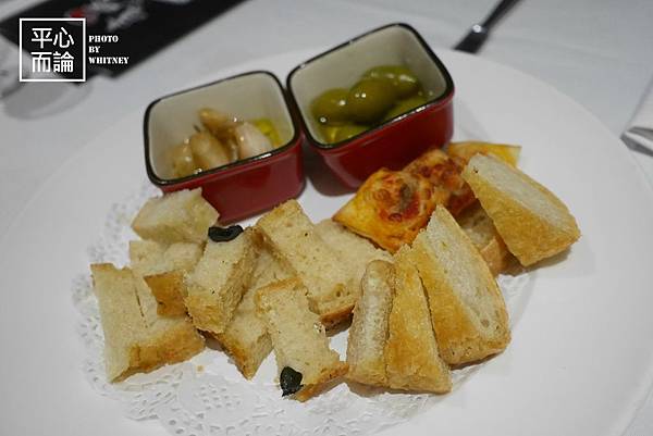 服務人員就送上招待的麵包盤及餐前酒