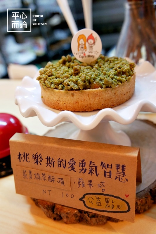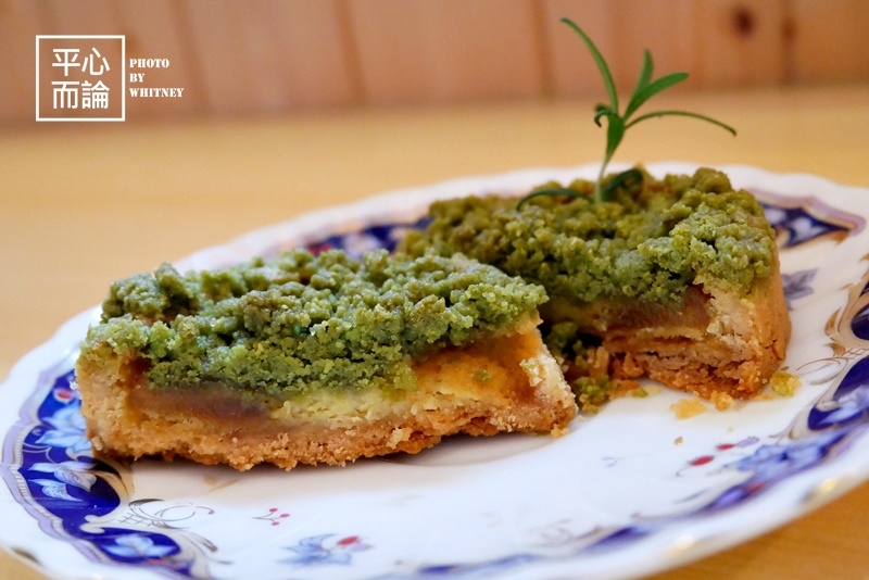 此甜塔是用新竹關西的蒸菁綠茶酥頂搭配焦糖蘋果派