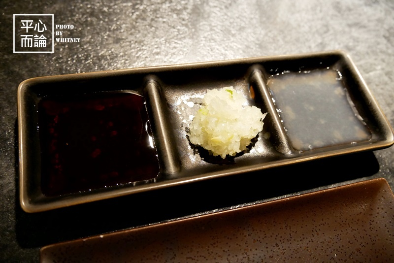 調味料由左至右依序為烤肉醬、鹽蔥、檸檬汁
