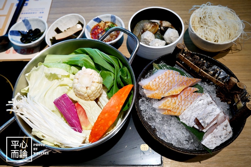 綜合菜盤的內容包括嚴選小農無毒蔬菜、Hi-Q 褐藻魚丸、白蝦、蛤蜊