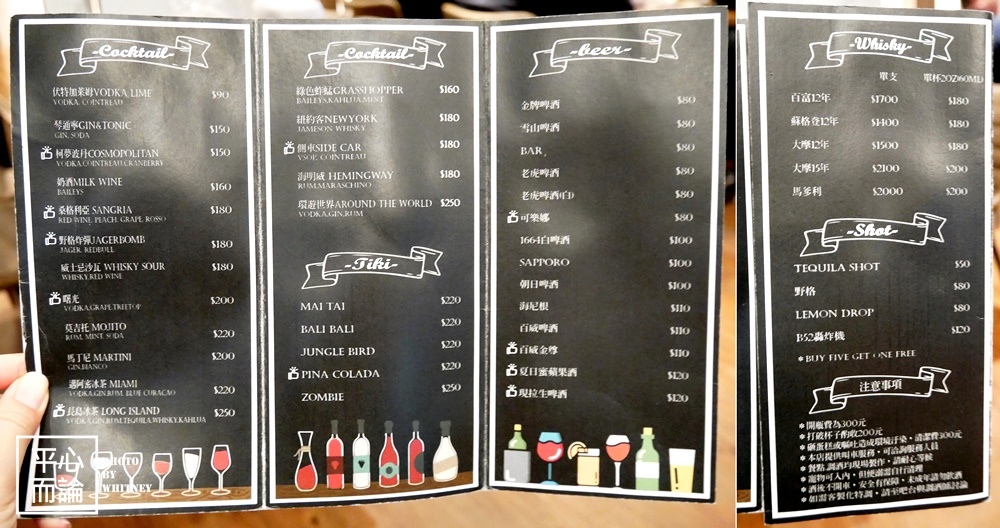 飲品方面雞尾酒、啤酒、威士忌等一應俱全