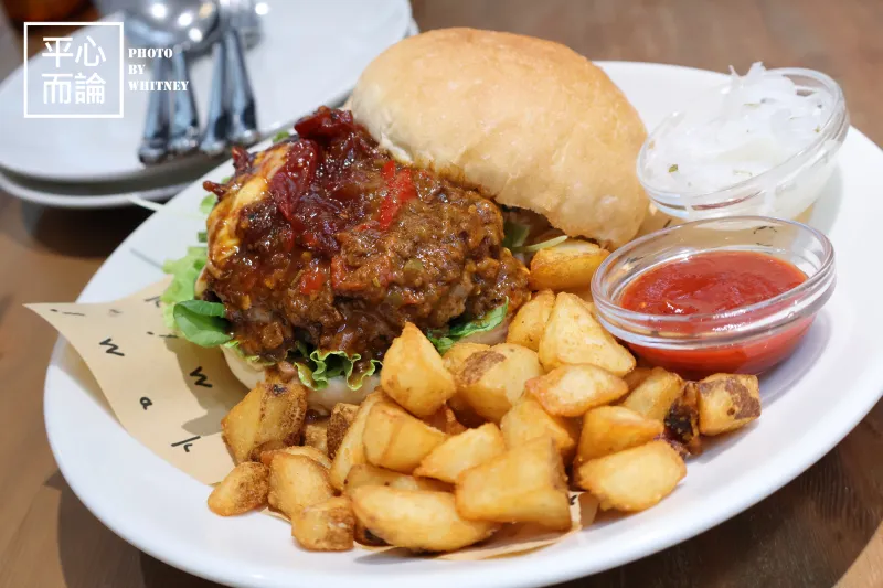 夾入糖漬蕃茄、辣肉醬、手打漢堡排、芝麻葉等料,