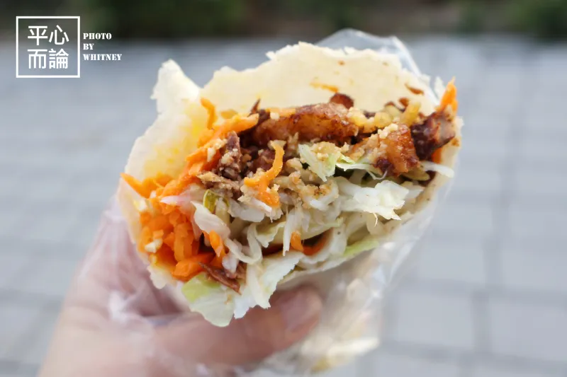 內餡有高麗菜、紅蘿蔔絲、豆芽菜、蛋酥等料,